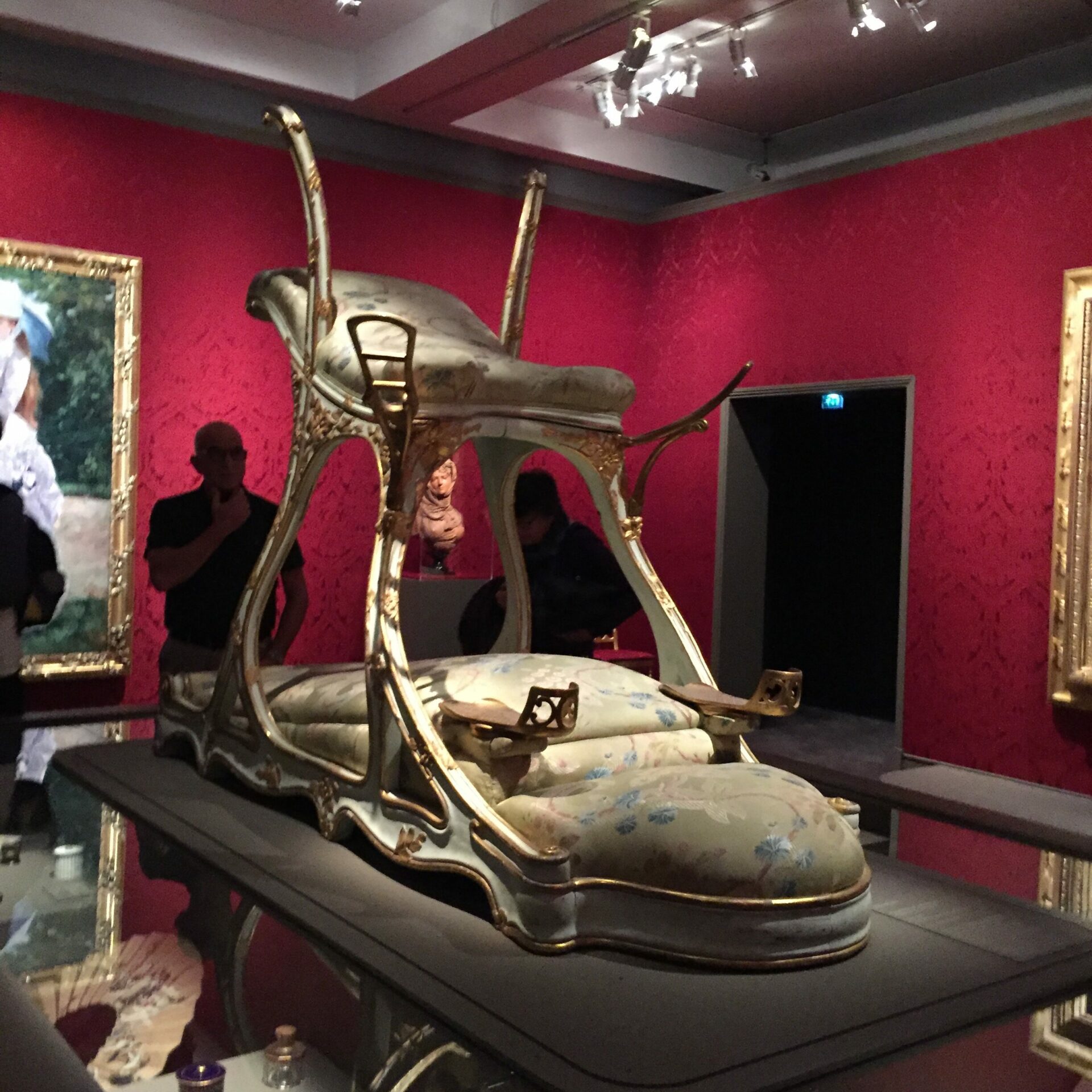 Les temps ont bien changé puisqu’ il fut une époque où le futur Édouard Sept fréquentait sans se cacher les bordels parisiens ; « Bertie » appréciait particulièrement Le Chabanais, un bordel de luxe fondé en 1878. Il y avait fait installer cette chaise d’Amour qui fut construite vers 1890 pour à la fois supporter la corpulence du prince de Galles et lui permettre d’avoir des relations avec deux femmes simultanément. On pouvait la voir au Musée d’Orsay lors de l’exposition sur la prostitution. Il y avait aussi un portrait de Valtesse de la Bigne par Gervex que l’on aperçoit en arrière -plan, et un martinet !